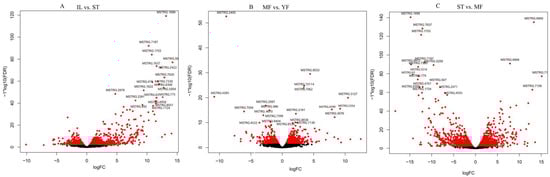 The volcano plots of differential expression genes (DEGs) between growth stages in O. sinensis. The X-axis represents fold change between IL and ST in (A), MF vs. YF in (B), and ST vs. MF in (C), while the Y-axis indicates significance of differential expression. The black dots signify no significant changes in the unigenes (|log2fold change| > 1, FDR < 0.05), while the red dots signify up- or down-regulated unigenes (|log2fold change∣ ≥ 1, FDR ≤ 0.05). IL is the mycoparasite complex of the cultivated O. sinensis; ST is the mummified larvae coated with mycelia of the cultivated O. sinensis; MF is mature fruiting body of the cultivated O. sinensis; YF is the wild-grown O. sinensis.