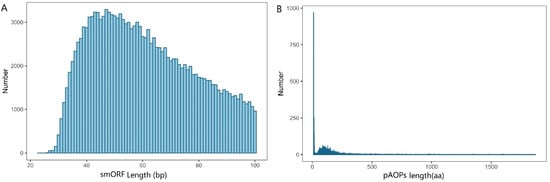 The length distribution of small open reading fragments (smORFs) in (A) and the putative antioxidant peptides (pAOPs) in (B).