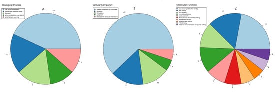 Pie chart of the top hit of GO function classifications of the AOPs in O. sinensis. The classification of biological processes (BP) in (A), cellular components (CC) in (B), molecular function (MF) in (C). GO slim categories from the Gene Ontology Consortium were used. Numbers following category name represent the number of the annotated AOP genes falling within that category from the top hit of GO annotation.