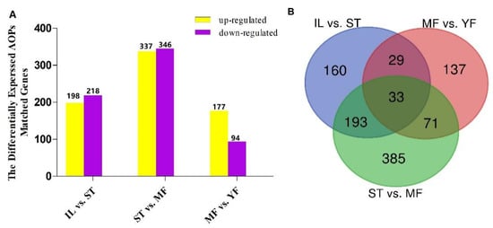 The differential expression analysis of AOPs (DAPs) between growth stages. (A) The number of DAPs was shown on the top of histograms. Statistics of DAPs in O. sinensis between different growth stages. (B) Venn diagram of DAPs comparing between different growth stages in O. sinensis. IL represents the mycoparasite complex of the cultivated O. sinensis; ST represents the mummified larvae coated with mycelia of the cultivated O. sinensis; MF represents the mature fruiting body of the cultivated O. sinensis; YF represents the wild-grown O. sinensis. The number of DAPs is shown on the top of histograms. Statistics of DAPs from O. sinensis between different growth stages.