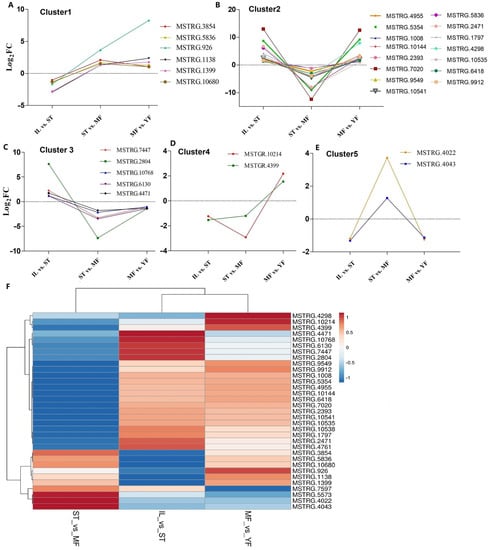 The identified AOPs were searched against the DEGs. A total of 1008 pAOPs was identified between stages (Figure 5, listed in Table S8). Totals of 270 DAPs were detected MF vs. YF (178 up-regulated, 92 down-regulated), 415 DAPs in IL vs. ST (198 up-regulated, 217 down-regulated), and 682 DAPs in MF vs. ST (337 up-regulated, 345 down-regulated). The number of DAPs in ST vs. MF was the highest, while that in MF vs. YF was the smallest, indicating that the differences in DAP expression primarily occurred between the stages of ST and MF. The Venn map showed that there were 33 common DAPs in the three comparisons (Figure 5). Furthermore, RNAs profiles of the 33 DAPs were analyzed (Figure 6). The results showed that there were five clusters with visible difference expression patterns (Figure 6A–E) in the three comparisons. In cluster one and five, with six and two DAPs, respectively, there were lower expression levels in IL compared to in ST, and higher expression levels in ST compared to MF, indicating that they had a gradual increase during the serial growth stages from IL to MF and might be associated with the whole growth process. In cluster 2 and 3, with 15 and 5 pDAPs, respectively, there were higher expression levels in IL compared to ST and lower expression levels in ST compared to MF, a decrease expression profile and then an increase expression profile upon the transition from the asexual- to sexual- stage, illustrating that these pDAPs might play important roles in fungus–larva interaction and fruit-body maturation. In clusters three and five, with five and two pDAPs, respectively, there were lower expression levels in MF compared to YF, indicating that these DAPs might be associated with habitat-adaptation in this fungus. Combined with the results of the Heatmap (Figure 6F), we found that 9 DAP-matched genes were up-regulated in ST compared to the other stages, including MSTRG.2804, MSTRG.4043, MSTRG.5836, and MSTRG.1138; 5 DAPs matched genes were up-regulated in YF compared to the other stages, including MSTRG.2804, MSTRG.7447, MSTRG.6130, MSTRG.4471, and MSTRG.10768; and about 13 DAP-matched genes had higher expression levels in MF compared to the other growth stages, such as MSTRG.10214, MSTRG.4298, MSTRG.10541, and MSTRG.6418.