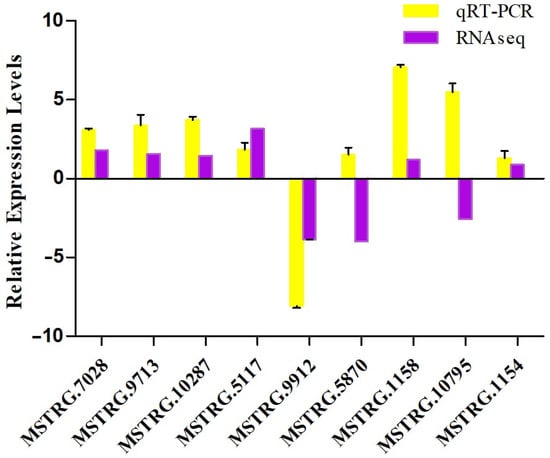 To confirm the reliability of transcriptome analysis using Illumina sequencing, nine transcripts encoding pAOPs were selected for qPCR validation. Specific primers were designed as listed in Table S9. Except for two genes (MSTRG.5870, MSTRG.10795), the other results of qPCR conformed to that of RNA-seqs (Figure 7), supporting the accuracy of the RNA-Seq and differential expression AOPs (DAPs) analysis.