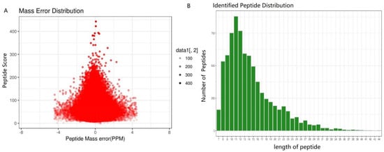 Proteins identified during the growth process of O. sinensis. (A) Mass error distribution of the identified peptides, (B) peptide length distribution.