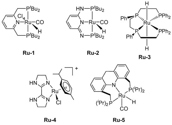 Subsequently, Huang et al. developed a Ru complex (Ru-4) with a bisimidazoline ligand for FADH in H2O because Li et al. demonstrated that the bisimidazoline ligand of an Ir complex was effective for FADH [16,32]. Although the catalytic activity of the Ru complex was lower than that of the Ir analog, a TOF of 12,000 h−1 and TON of 350,000 were achieved with HCOONa at 90 °C. In addition, highly pressurized H2/CO2 (24 MPa) was produced, without CO contamination. Recently, Milstein et al. obtained a high TON of more than 1.7 million and TOF of 3067 h−1, with Ru-5 bearing a 9H-acridine pincer ligand as the FADH catalyst at 95 °C [17]. The characteristic feature of this catalytic system is that it maintains catalytic activity for two months and has high durability in a neat solvent.