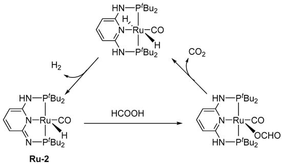 Pincer ligands are used in various catalysts because they provide high thermal stability [13]. Various pincer catalysts have also been developed for FADH. In 2014, Pidko et al. reported a well-defined Ru complex (Ru-1), with a PNP-pincer ligand for FADH, with a TOF of up to 257,000 h−1 and TON of 706,500 (DMF/NEt3, at 90 °C), without a CO byproduct [13]. Because the catalyst performed the hydrogenation of CO2 to formate with high activity, the researchers achieved 10 consecutive H2 storage/generation cycles in a DMF/DBU solvent mixture over 1 week. Huang and Zheng et al. studied a Ru complex (Ru-2) with a PNP-pincer ligand, a dearomatized pyridine moiety with an imine arm [14]. Using this catalyst for FADH, a TON of 95,000 was obtained under mild conditions without any additive (50 °C, in DMSO), with a TOF of 2380 h−1. Furthermore, the catalytic activity was improved by adding a base compound, such as NEt3, at 90 °C with a TOF of 7330 h−1 and TON of 1 100,000 in 150 h. The authors studied the reaction mechanism by 1H NMR analysis and suggested that the catalysis entailed the ligand aromatization–dearomatization process. In the first step, protonation (aromatization) of the imine nitrogen occurs, and the formate coordinates to the metal center. Subsequently, a dihydride complex is generated via CO2 elimination. Finally, the dihydride complex eliminates H2 gas via ligand dearomatization, leading to regeneration of the dearomatized pincer complex (Figure 2).