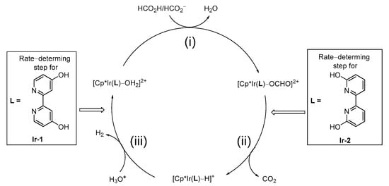 Various iridium catalysts are also reported to be effective (Figure 4). In 2009, Himeda discovered that Cp*Ir catalysts with N^N-bidentate ligands, such as 2,2′-bipyridine (BPy), catalyzed FADH [18]. This type of catalyst, which is water-soluble, is catalytically active toward aqueous FADH without organic bases, such as amine derivatives. Himeda et al. found that the electron-donating property of the ligand affected the improvement of catalytic performance. For example, Cp*Ir catalysts bearing 4,4′-dihydroxy-bipyridine (Ir-1) showed 80-fold higher catalytic activity than the BPy catalyst for FADH. Next, when the OH group on the ligand was moved to the ortho position, interesting findings were obtained from the viewpoint of the reaction mechanism [19,33]. First, the pH dependence of the catalytic activity differed greatly, depending on the substitution position of the OH group. Although the catalytic performances of Ir-1 and Ir-2 were almost similar under acidic conditions (pH 1.7), the catalytic activity of Ir-1 decreased as the pH increased. In contrast, Ir-2 showed the maximum TOF (5440 h−1) at pH 3.5. Subsequently, using deuterated FA (DCOOD) and D2O, the rate-determining step differed, depending on the position of the OH substituent because of the kinetic isotope effect (KIE). In FADH, it is speculated that the reaction proceeds through the following three elementary reactions: (i) formation of the formato complex by the reaction of the catalyst precursor and formate ion, (ii) formation of the Ir–H complex by the β-elimination of CO2, and (iii) hydrogen production by reaction of the Ir–H complex and a proton. The estimated rate-determining step (RDS) of Ir-1 was (iii) by KIE experiments, while the considered RDS of Ir-2 was (ii), owing to the pendant-base effect of the OH groups near the metal (Figure 5). This consideration is supported by the DFT calculations.