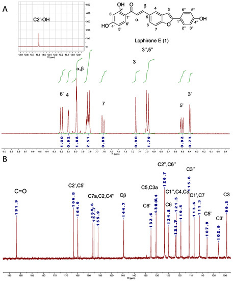The 1H and 13C NMR spectra of the synthetic lophirone E (1) are reported in Figure 3A,B and they are in very good agreement with those reported in the literature [25]. In particular, the 2′-OH is clearly evident at 13.6 ppm, as well as the spin system of the B ring comprising proton signals at 8.19, 6.53 and 6.41 ppm (Figure 3A). Finally, the double bond proton signals at 8.01 and 7.96 ppm present J values (15.5 Hz) typical of the trans geometry. 13C carbons (Figure 3B) have been assigned based on the spectral analysis reported in [25].