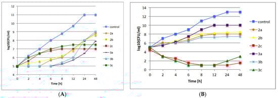 Time-kill kinetics of compounds 2a, 2b, 2c, 3a, 3b, 3c against S. aureus ATCC 29213 (A) and S. epidermidis ATCC 12228 (B). Samples were analyzed by plating and counting of colony-forming units (CFUs) at 0, 2, 4, 6, 8, 12, 24, 48 h. The blue line represents control culture grown in the absence of tested compounds, while orange, yellow, red, violet, turquoise and green lines represent cultures treated with tested compounds.