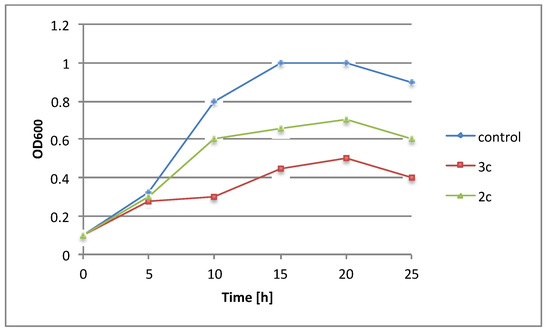 Antibiotics, such as B-lactams, may cause cell lysis and cell death by inhibiting the synthesis of the bacterial cell wall. Therefore, the next stage of the study examined the potential of the tested compounds to lyse bacterial cells and to determine the mechanism of any such antimicrobial activity. The method examined the effect of the compounds against the bacterial cell wall and cell membrane, which are major targets for many antibacterial agents. Exposition to 2a, 3a, 2b and 3b used at 1 × MBC was not found to change OD600 values of S. epidermidis ATCC 12228 cells (data not presented), suggesting that the treated bacterial cells were not lysed. Although compounds 2c and 3c demonstrated a bactericidal effect on S. epidermidis (Figure 1B), cell lysis studies indicated a quite moderate decrease in OD600 (Figure 2). This indicates that only partial cell lysis occurred, but it should be noted that OD measurements provided only an indication of total biomass obscuring the light path, and no insight into viable biomass. Therefore, OD measurements systematically underestimated lysis in late phase of growth, and additional, more advanced, studies of tested compounds, such as cell lysis inductors, are needed.