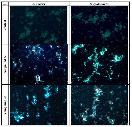 Bactericidal compounds usually lead to microbial cell death by cell lysis or DNA fragmentation, while bacteriostatic antimicrobials most commonly lead to inhibition of bacterial protein synthesis pathways [45]. For instance,β-lactams bind to transpeptidase PBPs (penicillin binding proteins) to inhibit cell wall synthesis, which may lead to cell lysis [46,47]. It is recommended that severely ill and immunosuppressed patients with bacterial infections receive bactericidal agents such as aminoglycosides, β-lactams, fluoroquinolones, glycopeptides, lipopeptides, nitroimidazoles and nitrofurans [48,49,50]. Our present studies with fluorescent dyes confirm that compounds 2c and 3c are able to reduce the viability of S. aureus and S. epidermidis cells via degradation of cell membranes. This process may be connected with the cell lysis caused by these compounds (Figure 2).