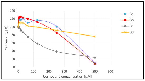 Similar to arene-ruthenium(II) complexes with pyrazole derivatives 2a–2c [17], complexes 3a–3c demonstrated cytotoxicity against regular eukaryotic cells, particularly above concentrations of 250 μM (Figure 5). IC50 values of 379.5 μM, 354.6 μM and 264.3 μM were achieved for 3a, 3b and 3c, respectively. However, complex 3d with an IC50 value of 892.0 μM, like complex 2d [17], did not exhibit significant cytotoxic effect in the range of concentrations tested (3.9–500 μM). In the presence of 3d, HFF-1 viability did not drop below 75% (Figure 5).