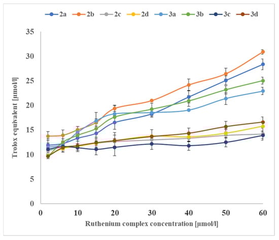 Results obtained by the ferric-TPTZ method shown that the tested ruthenium complex compounds had lower antioxidant capacity than the Trolox control (Figure 6). Compounds 2b, 2a, 3b, 3a had much better antioxidant activity than other tested complexes; all demonstrated particularly high antioxidant activities at higher concentrations (30 µmol/L–60 µmol/L) and their ability to remove free radicals was concentration dependent.