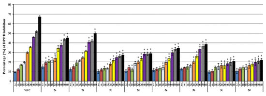 The percentage inhibition of DPPH for these complexes ranged from about 30% to 50%. Compounds 2c, 2d, 3c and 3d indicated very low antioxidant capacity across the entire range of applied concentrations. The percentage DPPH inhibition of tested compounds ranged from about 10% to 30%, and the highest used concentration (60 µmol/L) corresponded to approximately 12–15 µmol/L Trolox concentration for Fe (III) reduction. The results obtained for the DPPH radical scavenging are shown in Figure 7.