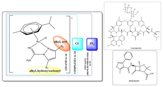 Selected structures of antibiotics and arene-ruthenium(II) complexes with carbathioamidopyrazoles (2a–2d) [17] and (3a–3d).