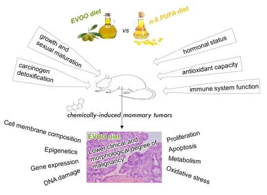 Effects and main mechanisms of action of high-EVOO diets, in comparison to high-seed-oil diets, on experimental mammary carcinogenesis. Animals fed the high-EVOO diet displayed tumors of lower clinical and morphological degree of malignancy. These effects can be related to systemic mechanisms influencing susceptibility and tumor initiation (growth and sexual maturation, liver capacity of carcinogen detoxification, hormone levels, antioxidant capacity and immune function), as well as molecular changes in tumors (in membrane composition, epigenetics, gene expression, DNA damage, oxidative stress, or metabolism, conducting cells to decreased proliferation and increased apoptosis).