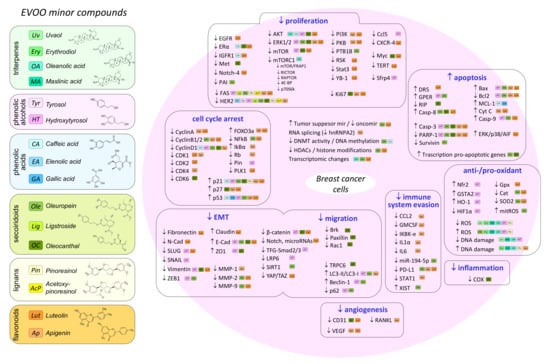 Breast cancer is the most frequent malignant neoplasia and a leading cause of mortality in women worldwide. The Mediterranean diet has been proposed as a healthy dietary pattern with protective effects in several chronic diseases, including breast cancer. This diet is characterized by the consumption of abundant plant foods and olive oil as the principal source of fat, which is considered one of the main components with potential antioxidant, anti-inflammatory and anticancer effects. Extra-virgin olive oil (EVOO) has several bioactive compounds, mainly including monounsaturated fatty acids, triterpenes and polyphenols, such as phenolic alcohols (e.g., hydroxytyrosol), secoiridoids (e.g., oleuropein and oleocanthal), lignans (e.g., pinoresinol) or flavonoids (e.g., luteolin). While epidemiological evidence is still limited, experimental in vivo and in vitro data have shown a protective effect of this oil and its compounds on mammary carcinogenesis. Such effects account through complex and multiple mechanisms, including changes in epigenetics, transcriptome and protein expression that modulate several signaling pathways. Molecular targets of EVOO compounds have a role in the acquisition of cancer hallmarks. Although further research is needed to elucidate their beneficial effects on human prevention and progression of the disease, evidence points to EVOO in the context of the Mediterranean diet as a heathy choice, while EVOO components may be promising adjuvants in anticancer strategies.