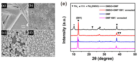 In the sequential deposition process, the quality of the perovskite film was decided by the PbI2 film [20]. Cheng et al. found that when the humidity is higher than 20% RH, PbI2 tends to exhibit an isolated structure, due to the moisture-induced heterogeneous nucleation and crystallization of PbI2 [21]. Our results indicate that the PbI2 thin films spin-coated under atmospheric conditions and in high humidity are coarse when using the PbI2 solution in DMF, whereas the PbI2 thin films are smooth when using the PbI2 solution in the DMF and DMSO mixture solvent under the same conditions, as shown in Supplementary Materials Figure S1. In Figure 2a, we can observe that the coarse PbI2 thin film exhibits an isolated branching structure, resulting in poor coverage of the MAPbI3 thin film. This can be demonstrated by the scanning electron microscopy (SEM) image of MAPbI3 in Figure 2c. On the contrary, the smooth PbI2 film exhibits the ideal morphology, with a high coverage rate and small pin-holes, as shown in Figure 2b. Therefore, the resulting MAPbI3 thin film exhibits a dense-grained uniform morphology, as presented in Figure 2d. Figure 2e shows the XRD patterns of the PbI2 films both without and with annealing, which explains the retarded crystallization of PbI2 with DMSO during the spin-coating process. Because there are so many diffraction peaks in the XRD figure, and most of them are the same for all the four PbI2 films, we use different symbols to distinguish these diffraction peaks from different materials. Without being annealed, the DMF-based PbI2 wet film shows an obvious diffraction peak centered at 12.6°, indexing to the (001) crystal plane of PbI2. These data imply that parts of PbI2 have crystallized in the spin-coating process. However, this diffraction peak was not observed in the PbI2 wet film with DMSO, indicating its amorphous feature. After heating the PbI2 film at 100 °C for 5 min, it showed a similar XRD pattern to that of the PbI2 film with DMF. The DMSO-retarded crystallization mechanism describes how DMSO has stronger coordination ability with PbI2 than DMF, and the intermediate state of PbI2 (DMSO)x is generated in PbI2 solution with mixed solvent. On the other hand, DMSO has a higher boiling point (189 °C) than DMF (152.8 °C), and a lower vapor pressure (0.76 kPa at 60 °C) [19]. Based on these reasons, the spin-coating process of PbI2 in mixed solvent describes how the PbI2 solution is concentrated with DMF evaporation, and the PbI2–DMSO phase is formed simultaneously. DMSO helps to retard the rapid crystallization of PbI2 during the spin-coating process, resulting in a uniform PbI2 wet film.