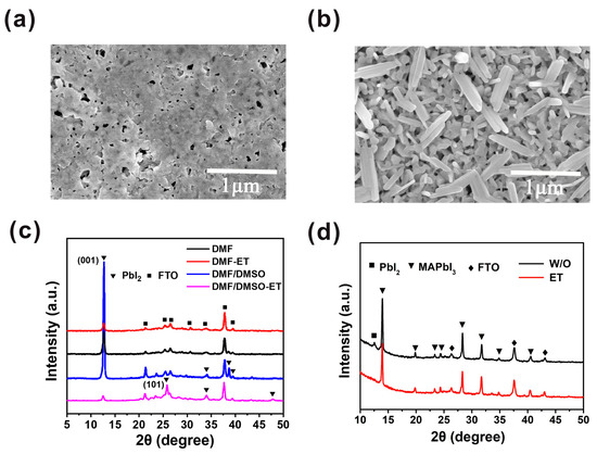 Characterization of PbI2 and MAPbI3 perovskite films without and with ethanol treatment. (a) SEM top view image of PbI2 film without ethanol treatment. (b) SEM top view image of PbI2 film with ethanol treatment. (c) XRD patterns of PbI2 films without and with ethanol treatment. (d) XRD patterns of corresponding MAPbI3 films without (black line) and with (red line) ethanol treatment.