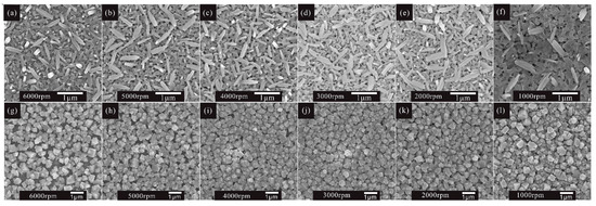 SEM top view images of PbI2 films prepared under different spin-coating speeds from (a–f) 6000 r.p.m. to 1000 r.p.m., and corresponding MAPbI3 films (g–l), respectively.