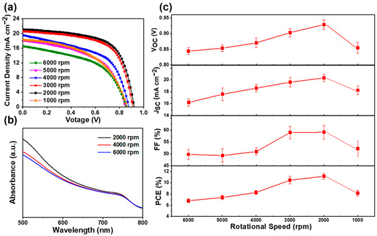 (a) J–V curves of perovskite solar cells prepared with PbI2 films under different spin-coating speeds from 6000 r.p.m. to 1000 r.p.m. (b) UV–vis absorption spectra of MAPbI3 films prepared under different spin-coating speeds of 6000, 4000, and 2000 r.p.m. for PbI2 films. (c) Variations in VOC, JSC, FF and PCE under different spin-coating speeds from 6000 r.p.m. to 1000 r.p.m.