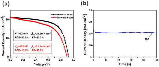 Due to the existence of hysteresis, the J–V measurement cannot evaluate the PCE of solar cells exactly. The differences in Voc and JSC are slight with forward scan and reverse scan. However, compared with the parameters under reverse scan, the FF obtained under forward scan is much lower (Figure 6). To precisely evaluate the performance of this device, a steady-state measurement was carried out for the device at the maximum power point (MPP). A JSC of 15.5 mA cm−2 was obtained when a bias voltage of 0.75 V was applied. Finally, the calculated PCE from the steady-state output measurement is 11.6%.