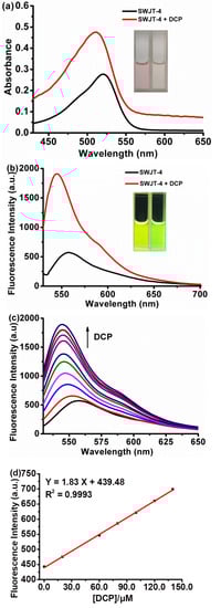 The fluorescence titration experiment of SWJT-4 was then studied. As shown in Figure 1c, the fluorescence intensity gradually increased with the increase in DCP. There was a good linear relationship between DCP concentration and the fluorescence intensity in the range of 0–140.0 μM (Figure 1d). The detection limit was calculated as 53.0 nM (Figure S6, Supplementary Materials), which was much lower than the reported lethal dose (0.01 mg/L) [46]. This result indicated that SWJT-4 had high sensitivity to DCP and could detect DCP at lower concentrations in an aqueous solution. Moreover, as shown in Figure S7 (Supplementary Materials), the recognition reaction finished within 100 min after the addition of DCP. The pseudo-first-order reaction constant (kobs) was 5.37 × 10−4 s−1. In order to verify the stoichiometry between the SWJT-4 and DCP, a Job plot analysis was performed (Figure S8, Supplementary Materials), which indicated that the ratio of SWJT-4 and DCP was 1:2. By Benesi–Hildebrand equation of this binding mode (1:2), a linear line with good linearity was obtained, and the binding constant was 1.37 × 106 M−2 (Figure S9, Supplementary Materials). These results were in good agreement with the stoichiometry between chemodosimeter and DCP.
