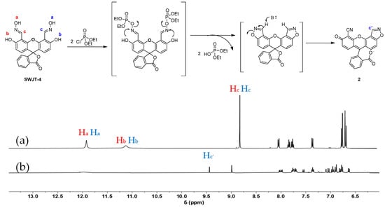 In order to identify the reaction mechanism between SWJT-4 and DCP, 1H NMR titration was performed. As shown in Figure 3a, the peaks at 11.90 ppm and 11.10 ppm belonged to the proton signals of two hydroxyl groups (Ha) on oxime moieties and two hydroxyl groups (Hb) on fluorescein in SWJT-4, respectively. The chemical shift of the proton (Hc) of the aldoxime group was at 8.80 ppm. After the addition of DCP, the original signals Ha and Hb in the probe disappeared, and one aldoxime proton Hc moved from 8.80 to 9.44 ppm downfield. The above results indicated that different reactions occurred at the two reaction sites of SWJT-4 to form product 2. One oxime group reacted with one DCP to form the nitrile [47], and the other oxime group reacted with another DCP to form an isoxazole ring. Firstly, the hydroxyl group in the oxime attacked the phosphorus center of DCP to form phosphate oxime. Then, another hydroxyl group in the adjacent position of the oxime group could intramolecularly attack this generated intermediate, and the isoxazole ring was then formed through a release of phosphate moiety [48]. Meanwhile, the mixture of SWJT-4 and DCP was also characterized by ESI-MS, and the peak at m/z 381.3 corresponding to product 2 was observed (Figure S10, Supplementary Materials).