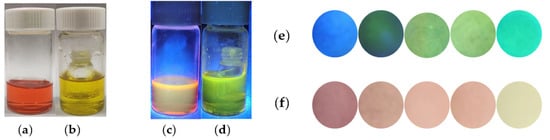 Figure 5. The color changes of (a,c) SWJT-4 (10.0 M) (DMSO–HEPES, 1/1, v/v, pH 7.4) solution and (b,d) exposure to DCP vapors under visible light or ultraviolet light. Paper sensors that visually detect different concentrations of DCP under ultraviolet light (e) and visible light (f). From left to right: [DCP] = 0 mM, 1.0 × 10−3 mM, 1.0 × 10−2 mM, 1.0 × 10−1 mM, 1.0 mM.