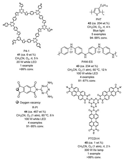 - Xiao, J.; Liu, X.; Pan, L.; Shi, C.; Zhang, X.; Zou, J.-J. Heterogeneous Photocatalytic Organic Transformation Reactions Using Conjugated Polymers-Based Materials. ACS Catal. 2020, 10, 12256–12283. [Google Scholar] [CrossRef]