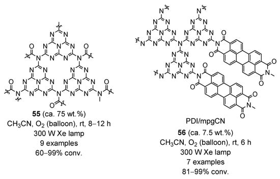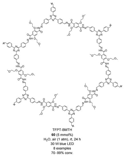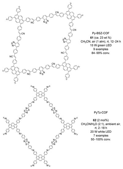 - Alemán, J.; Mas-Ballesté, R. Photocatalytic Oxidation Reactions Mediated by Covalent Organic Frameworks and Related Extended Organic Materials. Front. Chem. 2021, 9, 708312. [Google Scholar] [CrossRef]