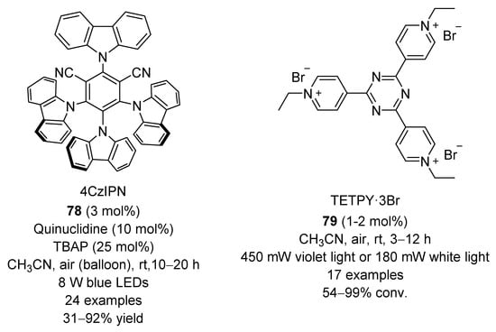 - Zeitler, K. Metal-Free Photo(redox) Catalysis. In Visible Light Photocatalysis in Organic Chemistry; Stephenson, C.R.J., Yoon, T.P., MacMillan, D.W.C., Eds.; Wiley-VCH: Weinheim, Germany, 2018; pp. 159–232. Available online: https://onlinelibrary.wiley.com/doi/10.1002/9783527674145.ch6 (accessed on 12 January 2022).
