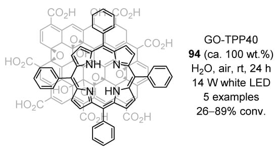 - Phuangburee, T.; Solonenko, D.; Plainpan, N.; Thamyongkit, P.; Zahn, D.R.T.; Unarunotai, S.; Tuntulani, T.; Leeladee, P. Surface Modification of Graphene Oxide Via Noncovalent Functionalization with Porphyrins for Selective Photocatalytic Oxidation of Alcohols. New J. Chem. 2020, 44, 8264–8272. [Google Scholar] [CrossRef]