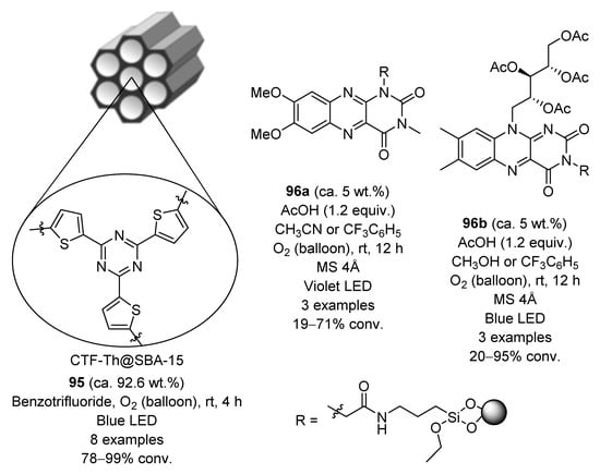 - Kurfirt, M.; Spackova, J.; Svobodova, E.; Cibulka, R. Flavin Derivatives Immobilized on Mesoporous Silica: A Versatile Tool in Visible-Light Photooxidation Reactions. Monatsh. Chem. 2018, 149, 863–869. [Google Scholar] [CrossRef]