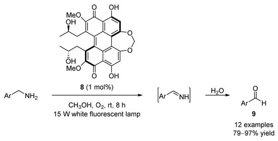 - Li, J.; Bao, W.; Tang, Z.; Guo, B.; Zhang, S.; Liu, H.; Huang, S.; Zhang, Y.; Rao, Y. Cercosporin-Bioinspired Selective Photooxidation Reactions Under Mild Conditions. Green Chem. 2019, 21, 6073–6081. [Google Scholar] [CrossRef]