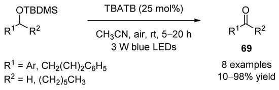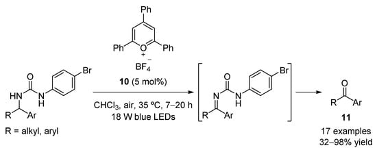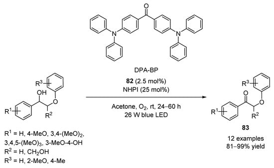 - Liu, X.; Lin, L.; Ye, X.; Tan, C.-H.; Jiang, Z. Aerobic Oxidation of Benzylic sp3 C-H Bonds through Cooperative Visible-Light Photoredox Catalysis of N-Hydroxyimide and Dicyanopyrazine. Asian J. Org. Chem. 2017, 6, 422–425. [Google Scholar] [CrossRef]