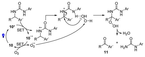 - Zelenka, J.; Svobodova, E.; Tarabek, J.; Hoskovcova, I.; Boguschova, V.; Bailly, S.; Sikorski, M.; Roithova, J.; Cibulka, R. Combining Flavin Photocatalysis and Organocatalysis: Metal-Free Aerobic Oxidation of Unactivated Benzylic Substrates. Org. Lett. 2019, 21, 114–119. [Google Scholar] [CrossRef]