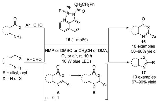 - Wei, L.; Wei, Y.; Zhang, J.; Xu, L. Visible-Light-Mediated Organoboron-Catalysed Metal-Free Dehydrogenation of N-Heterocycles Using Molecular Oxygen. Green Chem. 2021, 23, 4446–4450. [Google Scholar] [CrossRef]