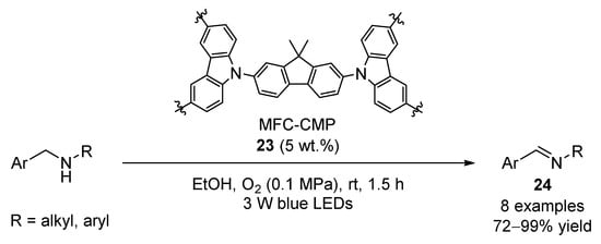 - Ko, J.H.; Kang, N.; Park, N.; Shin, H.-W.; Kang, S.; Lee, S.M.; Kim, H.J.; Ahn, T.K.; Son, S.U. Hollow Microporous Organic Networks Bearing Triphenylamines and Anthraquinones: Diffusion Pathway Effect in Visible Light-Driven Oxidative Coupling of Benzylamines. ACS Macro Lett. 2015, 4, 669–672. [Google Scholar] [CrossRef]