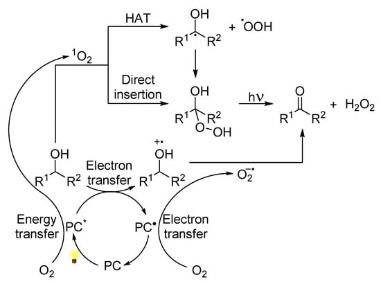 - Gambarotti, C.; Melone, L.; Caronna, T.; Punta, C. O2-Mediated Photocatalytic Functionalization of Organic Compounds: Recent Advances Towards Greener Synthetic Routes. Curr. Org. Chem. 2013, 17, 2406–2419. [Google Scholar] [CrossRef]