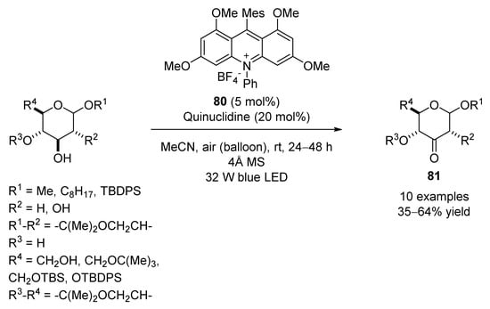 - Gorelik, D.J.; Dimakos, V.; Adrianov, T.; Taylor, M.S. Photocatalytic, Site-Selective Oxidations of Carbohydrates. Chem. Commun. 2021, 57, 12135–12138. [Google Scholar] [CrossRef]