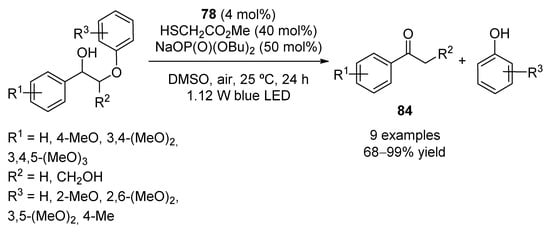 - Chen, K.; Schwarz, J.; Karl, T.A.; Chatterjee, A.; König, B. Visible Light Induced Redox Neutral Fragmentation of 1,2-Diol Derivatives. Chem. Commun. 2019, 55, 13144–13147. [Google Scholar] [CrossRef]