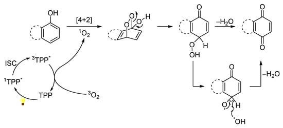 - Wellauer, J.; Miladinov, D.; Buchholz, T.; Schütz, J.; Stemmler, R.T.; Medlock, J.A.; Bonrath, W.; Sparr, C. Organophotocatalytic Aerobic Oxygenation of Phenols in a Visible-Light Continuous-Flow Photoreactor. Chem. Eur. J. 2021, 27, 9748–9752. [Google Scholar] [CrossRef]