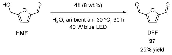 - Ayed, C.; Huang, W.; Kizilsavas, G.; Landfester, K.; Zhang, K.A.I. Photocatalytic Partial Oxidation of 5-Hydroxymethylfurfural (HMF) to 2,5-Diformylfuran (DFF) Over a Covalent Triazine Framework in Water. ChemPhotoChem 2020, 4, 571–576. [Google Scholar] [CrossRef]