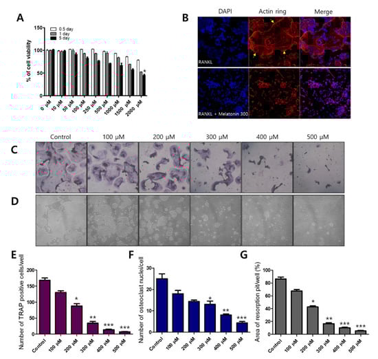 Inhibitory effect of melatonin on RANKL-induced osteoclastogenesis. (A) Cell viability of RAW 264.7 cell macrophages treated with various concentrations of melatonin for 0.5 to 5 days according to MTT assay. (B) RAW264.7 cells were cultured with RANKL or RANKL + melatonin for 5 days. Cells were stained with fluorescein rhodamine phalloidin to detect the presence of actin rings. The yellow arrow indicates the edge of the actin ring. (C,E) Number of TRAP-positive multinucleated RAW 264.7 cells containing three or more nuclei after treatment with 10 ng/mL RANKL and 100 to 500 μM melatonin. (F) Number of osteoclast nuclei. (D,G) Resorption pit formation and resorption areas expressed as area of pit formation with respect to total area. Values represent the means of three independent experiments ± SDs (n = 6). * p < 0.05, ** p < 0.01, and *** p < 0.001 compared with the control.