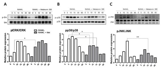 Effects of RANKL and melatonin treatment on MAPK signaling in RAW264.7 cells. Cytosolic protein levels of (A) p-ERK, (B) p-p38, and (C) p-JNK in RAW 264.7 cells treated with RANKL (10 ng/mL) and RANKL (10 ng/mL) + melatonin (300 μM) for 5, 10, 15, 30, and 60 min according to western blot analysis. The expression data were normalized to the total MAPK (ERK, p38, and JNK) signal. Values represent the means of three independent experiments ± SDs. RANKL alone treatment and RANKL + melatonin combination treatment were verified using a paired sample t-test (* p < 0.05, ** p < 0.01).