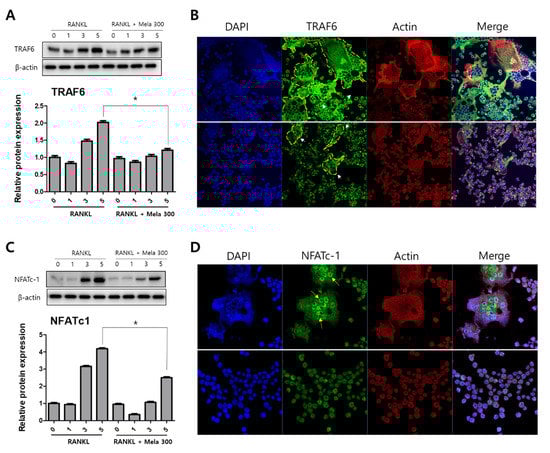 RAW 264.7 cells were seeded on a Nunc™ Lab-Tek™ II Chamber Slide™ System (Nunc; Thermo Fisher Scientific, Rochester, NY, USA) and incubated for 2 h in a CO2 incubator to allow the cells to adhere to the bottom of the slide well. Then, cells were applied to a differentiation medium and 300 µM of melatonin. The medium was replaced daily for 5 days. Cells were fixed in 4% formaldehyde solution (Sigma-Aldrich, Louis, MO, USA) for 10 min, and 0.2% Triton X-100 was applied for 10 min at room temperature to allow the antibody to penetrate the cells. Subsequently, to block nonspecific binding, the cells were blocked with PBS including 1% bovine serum albumin (BSA) for 1 h. The cells were incubated in the primary antibody (diluted at 1:100; NFATc1 and TRAF6 (Cell Signaling Technology, Beverly, MA, USA)) at 4 °C overnight. The cells were washed 3 times with PBS, then the secondary antibody (diluted at 1:200; Alex Fluor 488 anti-mouse; Invitrogen Gaithersburg, MD, USA) was incubated for 1 h at room temperature. Then, rhodamine phalloidin (Invitrogen, Eugene, OR, USA) was applied for 30 min to stain actin, and DAPI (Invitrogen, Eugene, OR, USA) was applied for 10 min to stain the nucleus. The expression of each protein was scanned and analyzed using a Zeiss LSM 750 laser scanning confocal microscope (Göttingen, Germany).