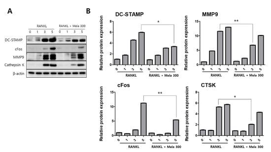 RAW 264.7 cells (1 × 106 cells) were seeded in 100 mm culture dishes and incubated for 2 h in a CO2 incubator to allow the cells to adhere to the bottom of the culture dishes. After 2 h, the medium was replaced with a differentiation medium containing 10 ng/mL of RANKL (DMEM including 10% FBS). Cells were treated with 300 μM melatonin and incubated for a minimum of 5 min and a maximum of 5 days. At the end of each treatment, cells were harvested and lysed using RIPA lysis buffer (Sigma-Aldrich, Louis, MO, USA). The protein concentration was determined using a protein assay kit (Bio-Rad, Budapest, Hungary) according to Bradford’s method for protein quantification [48]. The amount of protein was 20 µg and each sample was loaded on a 10% SDS-PAGE gel and transferred to a polyvinylidene difluoride (PVDF) membrane (Amersham GE Healthcare, Little Chalfont, UK). Then, the membrane was blocked using 5% non-fat dried milk. The primary antibody (1:1000) was reacted at room temperature for 1 h; the antibodies used in this study are as follows: ERK (Cell Signaling Technology, Beverly, MA, USA), phospho-ERK (Cell Signaling Technology, Beverly, MA, USA), JNK (Cell Signaling Technology, Beverly, MA, USA), phospho-JNK (Cell Signaling Technology, Beverly, MA, USA), NFATc1 (Cell Signaling Technology, Beverly, MA, USA), TRAF6 (Cell Signaling Technology, Beverly, MA, USA), c-Fos (Cell Signaling Technology, Beverly, MA, USA), DC-STAMP (Abcam, Cambridge, MA, USA), MMP9 (Abcam, Cambridge, MA, USA), cathepsin K (Abcam, Cambridge, MA, USA), ATP6v0d2 (Abcam, Cambridge, MA, USA), and β-actin (Santa Cruz Biotechnology Inc., Santa Cruz, CA, USA). Thereafter, the membrane was washed with PBS-T (phosphate-buffered saline with Tween 20) 5 times for 10 min each. HRP-conjugated secondary antibody (1:5000) was reacted at room temperature for 1 h and then washed with PBST 5 times for 10 min each (mouse anti-rabbit IgG (Enzo Life Sciences, Farmingdale, NY, USA) and rabbit anti-mouse IgG (Enzo Life Sciences, Farmingdale, NY, USA)). SuperSignal™ West Femto Maximum Sensitivity Substrate (Thermo Scientific, Rockford, IL, USA) was used to perform immunoblotting and Image Quant LAS 500 (GE Healthcare, Chicago, IL, USA) was used to detect the protein expression.