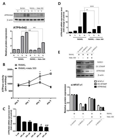 Regulation of V-ATPase (Atp6v0d2) expression following (A,D) treatment of RAW264.7 cells with RANKL and RANKL + melatonin for 1, 3, and 5 days. (A) Graph of Atp6v0d2 expression according to western blotting. (D) mRNA expression of Atp6v0d2 according to real-time PCR. Values represent the means of three independent experiments ± SDs RANKL alone treatment and RANKL + melatonin combination treatments were verified using a paired sample t-test (* p < 0.05, ** p < 0.01, and *** p < 0.001). (B) ATPase activity was conducted in RAW264.7 cells treated with RANKL (10 ng/mL) and melatonin (100 to 500 μM) for 1 to 5 days and (C) Atp6v0d2 gene expression of RAW264.7 cells treated with RANKL (10 ng/mL) + melatonin (100 to 500 μM) for 24 h. (E) After transfection of si-NFATc1 into RAW264.7 cells, RANKL and RANKL + melatonin 300 were treated for 1 day. NFATc1 knockdown using small molecule interfering (si) RNA decreased the total amount of DC-STAMP and ATP6V0d2. Values represent the means of three independent experiments ± SDs (# p < 0.05 and ## p < 0.01 compared with the control).