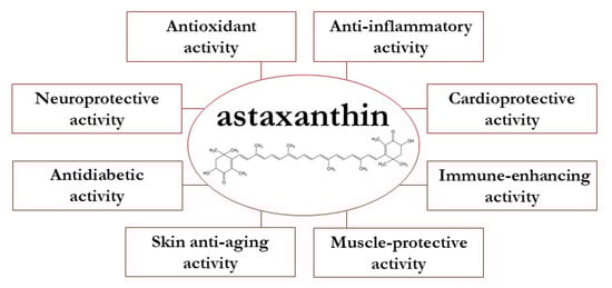 Redox homeostasis, an important component for the maintenance of normal physiological functions, is achieved by a well-controlled regulation between the formation and removal of reactive oxygen species (ROS) in the body system. An excess of oxidative molecules generated by a redox imbalance may damage cellular macromolecules, leading to a variety of detrimental effects associated with inflammation and disease development [23]. AST possesses the ability to modulate redox imbalance and inflammatory status and, therefore, it can be used as a potential tool in the clinical management of various chronic conditions [24,25,26]. Below, we give a summary of important biological activities mediated by AST (Figure 1).