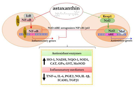 Although it is still under elucidation, recent studies have also demonstrated that AST may play a key role in modulating the complex interplay/crosstalk mechanism between Nrf2 and NF-κB pathways. Nrf2 activation has been related to its ability to antagonize NF-κB, suggesting that the induction of Nrf2 mediates anti-inflammatory responses (Figure 2) [110]. Moreover, in vitro and in vivo data have revealed that AST enhances Nrf2 activity and its antioxidant enzymes, inhibits pro-inflammatory mediators, and attenuates the NF-κB signaling network. Farruggia et al. have indeed shown that AST exerts its anti-inflammatory effect not only by inhibiting nuclear translocation of NF-κB p65 and decreasing the expression of IL-6 and IL-1β but also by reducing cellular ROS accumulation in Nrf2-dependent and -independent mechanisms [111].